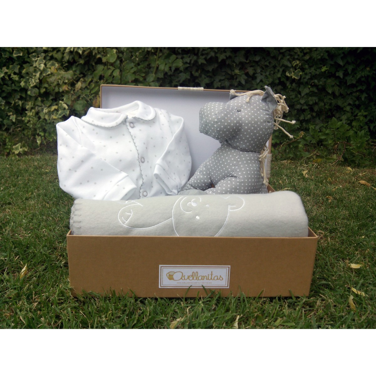 Pijama blanco con estrellas grises, manta polar gris, caballito gris y tarjetón de felicitación.