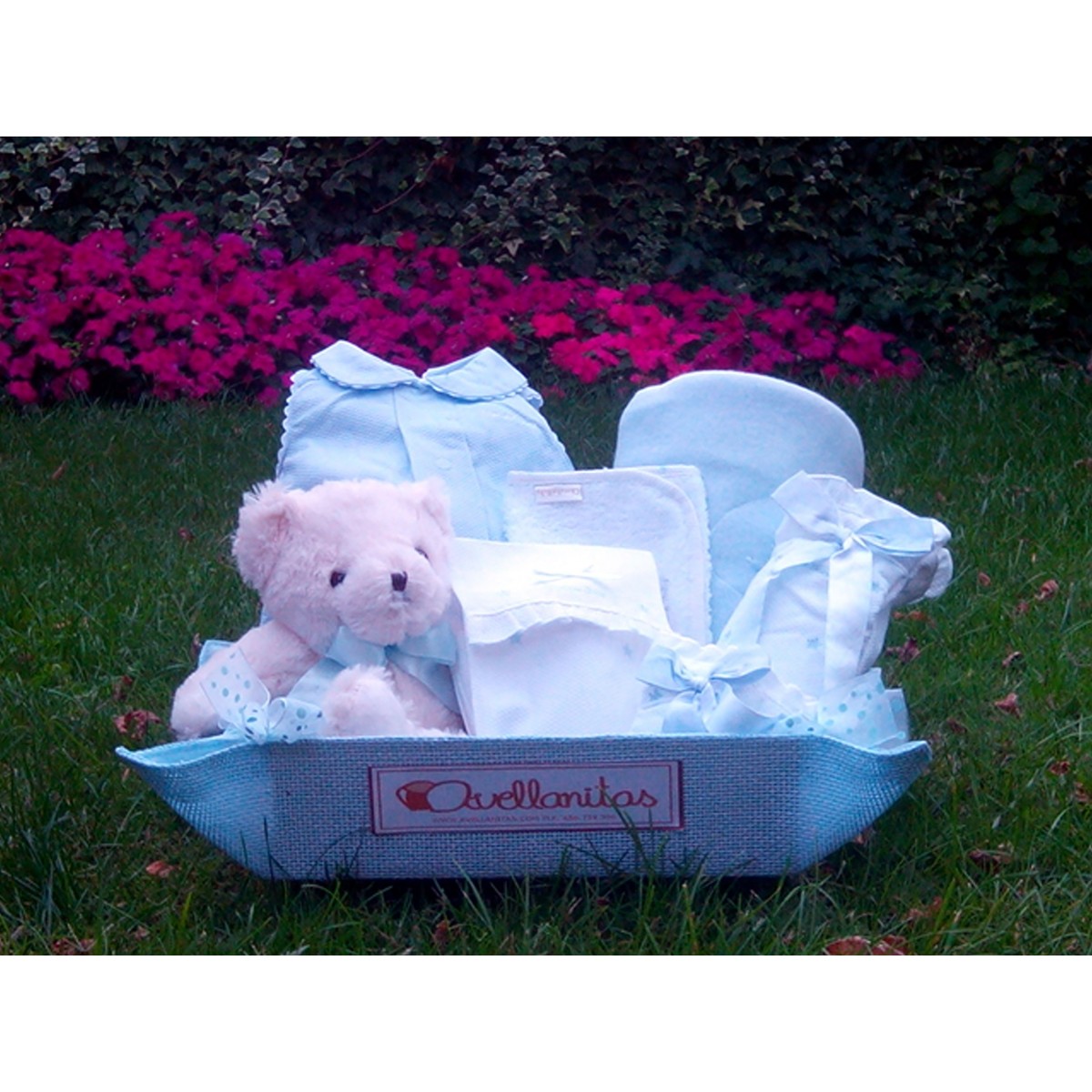 Ranita azul con bodoques blancos, manta polar, conjunto de portabiberón y portachupete, osito, toalla de hombro, porta pañales, cesta azul de rafia y tarjetón de felicitación.